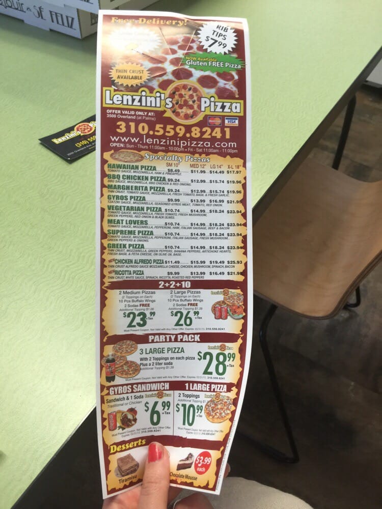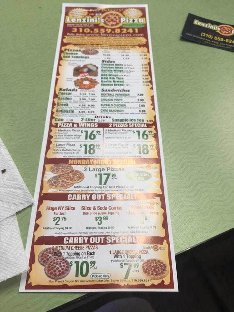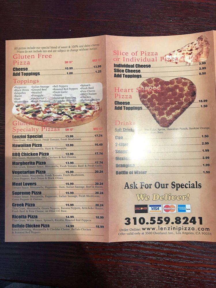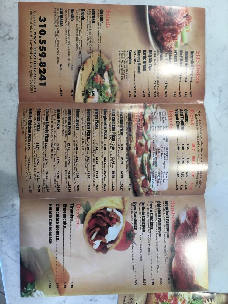 Introducing the menu at Lenzini's Pizza, a beloved spot in Los Angeles offering a variety of options for all pizza lovers. With a focus on quality and consistency, Lenzini's provides delicious pizzas with generous toppings, savory appetizers like Gyros Sandwich Combo, fresh salads, and refreshing drinks. Customers rave about the friendly staff, quick service, and affordable prices. The restaurant also caters to different dietary needs with vegan options and provides a comfortable dining experience with options for takeout, delivery, and outdoor seating. Lenzini's commitment to customer satisfaction shines through their attention to detail and tasty offerings, making it a go-to destination for pizza cravings in the West LA area.